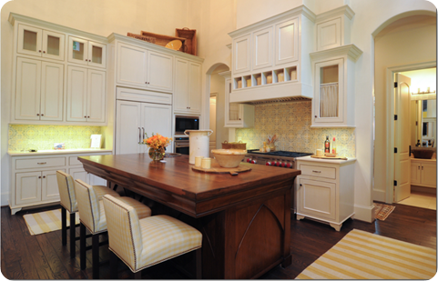 Excuse the poor lighting in this one, but I took this one in a model home near our house. I love the molding on the vent hood and the way they added “feet” to the bottoms of the cabinets to make them look like furniture.